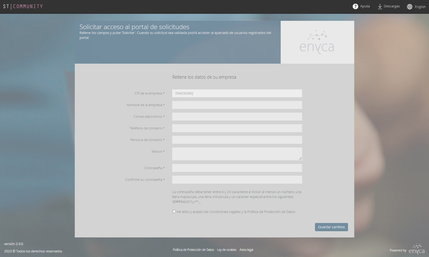 En primer lugar, será necesario introducir el CIF de su empresa y pulsar en el botón “Solicitar acceso al portal”. A continuación, deberá rellenar el resto de datos de su empresa: